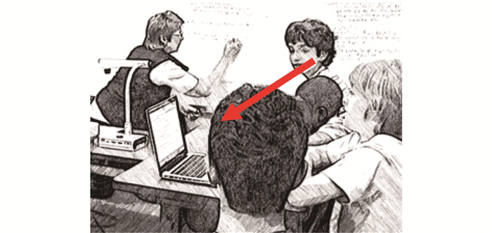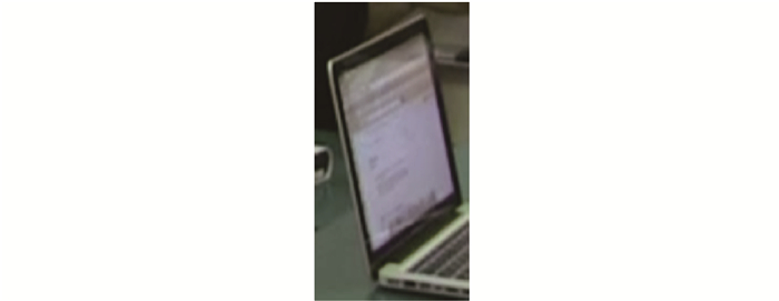 那么,教师和马特为什么会在这么短的时间内改变看法呢?如果没有视频数据,没有对“社会的身体”和“身体与物件”的敏感,我们对这一说服过程就将失去很关键的一层理解:我们将会遗漏这段互动中的另一个主角,它对“说服”所起到的作用不亚于——甚至还要超出——乔和卢克的角色。这个主角就是卢克面前那台笔记本电脑,也就是拉图尔的行动者网络理论所提出的“行动者”(Latour, 1996b;2005)。在卢克第二次插入对话之前和之后,他的电脑屏幕上的内容是不一样的(图 16和图 17)。我们可以合理地猜测,他当时正在用电脑查找相关信息,而第二次插话时的电脑屏幕上的内容,大致就是他说出来的内容。卢克的语言可以进一步印证这一猜测。“所以”这一连接词,在课堂话语中通常具备“指向乃至先前话语”的功能(O’Connor & Michaels,1996),并且标记接下来的一段较长的话语(Bolden,2009)。在这段对话中,所有的“所以”都可以就此理解,唯独卢克第二次插入的话,以“所以”开头,但却没有重复先前的话语,也没有特定的指向,那么我们可以更加合理地猜测,这个“所以”所指向的就是电脑所查找出来的相关内容。当卢克开始插话时,马特望向他(图 13),然后立即顺着卢克的眼神望向了电脑屏幕(图 14),然后又望向卢克(图 15)。在马特眼神转向的这短短两秒钟内,我们可以看到电脑这一行动者的“现身”:它开始借由卢克的身体发出声音、表达观点。在这个课堂情境中,网络信息的权威性超过了马特、卢克、乔、教师,乃至在场的其他任何人,而马特意识到了这一点。这便是这一“说服”与“被说服”的过程之关键:不是卢克说服了马特,而是笔记本电脑——作为借由卢克发声的“行动者”——说服了马特。