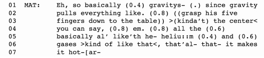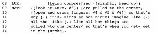 第一,马特的观点表达不仅仅在语言层面,也在身体层面。当他说“重力把气体拉向中心”时,他的双手也在同时做出牵拉与分合的动作。作为互动研究者,我们不能假定他的手势次于他的语言,处于辅助表达的位置,而应该将二者置于平等的地位。