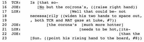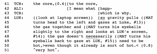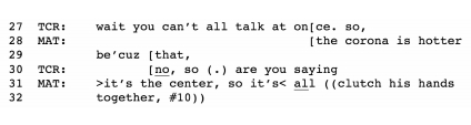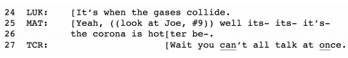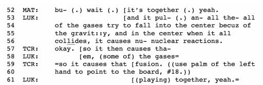从转录文本可见,马特与其他两位学生的争论焦点主要在“何为太阳热的原因”。马特认为原因在于重力把本来已经很热的气体拉到了太阳的中心,所以太阳就变得更加热。乔用“日冕比太阳(的核心)更热”这一证据来驳斥这一说法,因为倘若按照马特的思路,太阳的热度就应该从核心向外递减,那么就无法解释为什么日冕会更热。在此基础上,卢克进一步指出,气体本身并不必然是热的,但在被重力拉向中心的过程中,发生了碰撞,这才是太阳之所以这么热的原因。