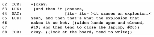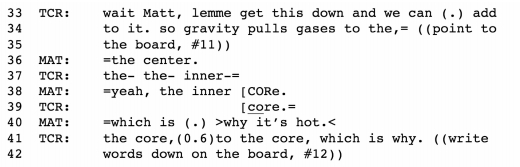 第三,乔对马特的质疑也不仅仅在语言层面,也在物件层面。当他说“日冕比太阳热多了”的时候,我们很容易将其理解为一种不同观点的表达。那么,为什么马特并没有质疑这一观点,而是试图解释其原因(“日冕更热这是因为……”)呢?最可能的假设是,在当时的情境里,“日冕更热”已经是一个共识。如果看不到身体,这一假设就无从考证。其实,在这一片段之前,他们已经讨论过太阳各层(如核心、色球层、过渡区)的温度,并全部记在了白板上,而乔的右手正是指向白板上的这一内容。因此,当我们把语言(“日冕比太阳热多了”)、身体(手的指向)和物件(白板)同时纳入到分析之中,我们就能理解这句话并非在表达不同的观点,而是在引用已有的证据。