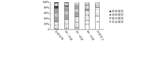 (三) 不同年龄、性别和学历中小学教师教育信息技术应用状况的比较 1. 不同年龄教师教育信息技术应用状况比较笔者将中小学教师的年龄分为25岁以下、26~35岁、36~45岁、46~55岁、56岁以上五个年龄段,对不同年龄段的教师教育信息技术的整体使用量进行统计,结果见图 3。