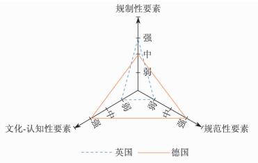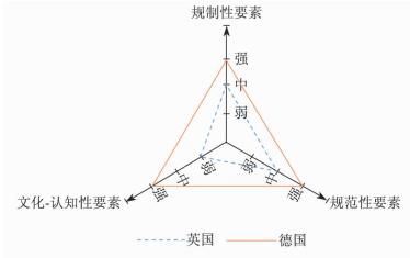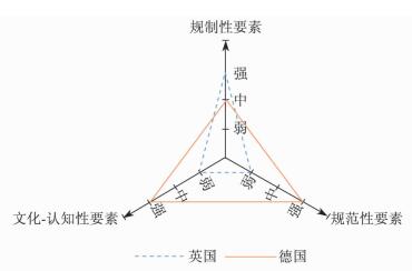 (三) 分析与小结将德国和英国并置比较,就会发现两国学徒激励的制度互补性程度和方式各不相同。相对而言,德国制度更加均衡。在规制性要素上,德国主要依靠强制的教育分流制度,总体强度中等,其规范性要素和文化-认知性要素则较强。而英国在规范性要素和文化-认知性要素方面都较为薄弱,但在规制性要素上以“激励”为导向,总体较强。两者在制度互补性分析框架中的对比见图 2。德国制度的互补性表现为三个维度的相互加强,而英国制度的互补性则表现为规制性要素对规范性要素以及文化-认知性要素的弥补。另外,虽然两国学徒激励的具体制度不同,但其核心都在于向学徒提供良好的职业前景预期。