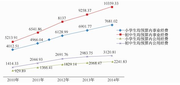 图 2 2010年-2014年义务教育生均预算内事业经费与生均预算内公用经费增长情况 |