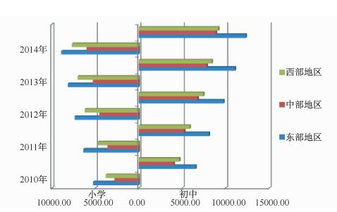 近5年,义务教育经费总投入不断增长,但是经费总投入仍显不足,而且区域间经费投入比例结构不合理。如图 4所示,2010年到2014年,义务教育生均预算内教育事业经费一直呈“中部塌陷”的情况。过去五年,中部地区小学生均预算内教育事业经费始终低于东部地区和西部地区,依次低于东部地区2446.81元、2784.68元、2847.55元、2888.46元和2918.24元,依次低于西部地区994.27元、1101.28元、1672.37元、1763.85元和1701.88元。中部地区初中生均预算内教育事业经费也低于东部地区和西东部地区,依次低于东部地区2535.35元、2844.68元、2982.80元、3251.70元和3445.95元,依次低于西部地区659.66元、640.71元、672.27元、586.13元、和270.48元。