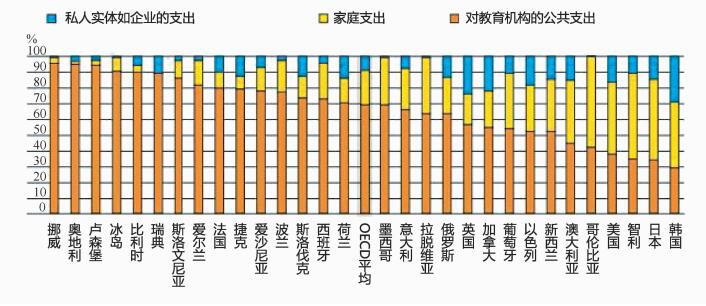 经合组织国家在公共部门和私人部门分担高等教育经费支出的比例上存在差异大多数国家都承认高等教育的重要性并有相似的目标,比如促进知识经济、增加入学机会和提高毕业率,以及在确保高等教育需求增加的同时,至少保持高等教育系统财政的可持续性。然而,经合组织国家不仅在生均经费水平上存在显著差异,各国政府、学生和他们的家庭以及其他私人机构(比如私人企业和非营利组织) 分担经费支出的比例也有很大的差异。