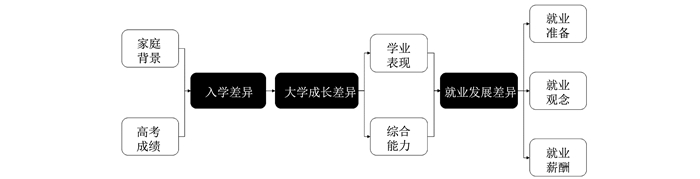 二、研究设计 (一) 研究思路研究通过比较城乡学生进入大学、大学成长与就业发展三个阶段来综合讨论两类学生群体的表现差异(见图 1)。第一,比较城乡学生入学时点差异,以家庭经济条件、父母受教育水平为代表的家庭背景变量和以高考成绩为代表的学习成绩变量。其中,家庭经济条件、父母受教育水平是较为稳定的因素,很少情况下会发生显著改变,代表了城乡学生长期以来的阶层差异。而高考成绩则能较为直观地反映学生入学时的学习成绩差异。这两类变量代表的差异,在城乡学生未来发展中都可能产生了不同程度的长期影响。