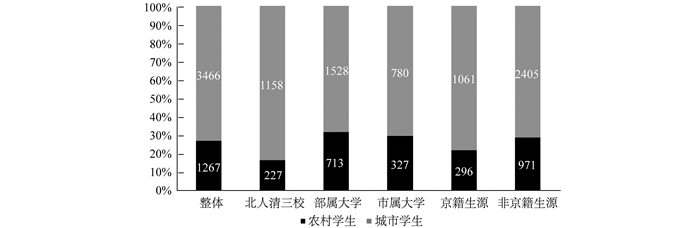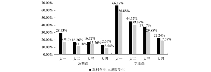 综上,研究从北京市城乡学生的入学差异与表现来看,家庭背景是农村学生的必然劣势,在这些因素的影响下,农村学生在进入大学时的学习起点就已经产生明显差距,同时大学期间他们的家庭背景也很难有较大的改善。那么,农村学生进入大学学习,身上背负的差距是否会在他们大学的成长与发展中进一步体现,从而扩大两类群体之间的差异,值得深入讨论。