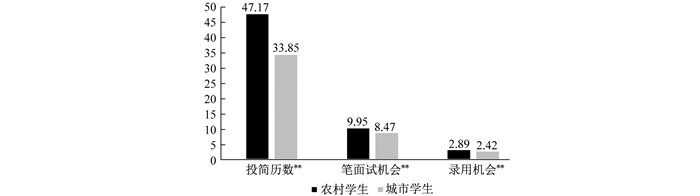 从城乡学生的就业准备来看(见图 4),两类学生群体形成明显的差异,农村学生在就业准备中投入更多。农村学生投简历的平均数量为47.17次,是城市学生的1.39倍,获得笔面试的机会为9.95次,是城市学生的1.17倍,而获得录用机会的数量也超过了城市学生。从这些结果来看,农村学生在就业过程中投入更多。但是,若是以录用机会数量除以投简历数来衡量他们的求职效率,农村学生求职效率为18.14%,而城市学生为23.31%,两者存在显著差异(p < 0.001),城市学生的求职效率更高。可见,农村学生在求职过程中,依然通过更多的尝试来提升自己的求职结果,其实质依然是以勤补拙。