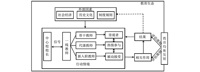 基于新制度主义理论,在复杂的政策实施过程中,教师个体的差异化行为其实也可以得到某种一致性解释:教师(包括校长)作为理性的行动者,他们会根据行动情境采取基于自身效用最大化的行动策略。只不过因个人所处环境有差异,面临的约束条件不同,从而导致不同的行动选择。面临两难抉择的中心校校长采取了派遣代课教师、新入职教师走教的“自保性策略”,这一行为向其他教师传递了骨干教师可以置身事外的行动信号,这一信号在不同教师主体之间的互动中被不断强化,最终形成了为大多数教师所认可的非正式制度,并与正式制度相交织反作用于制度情境。从这个角度看,IAD理论框架对于我们理解县域内教育政策实施有较强的指导意义。