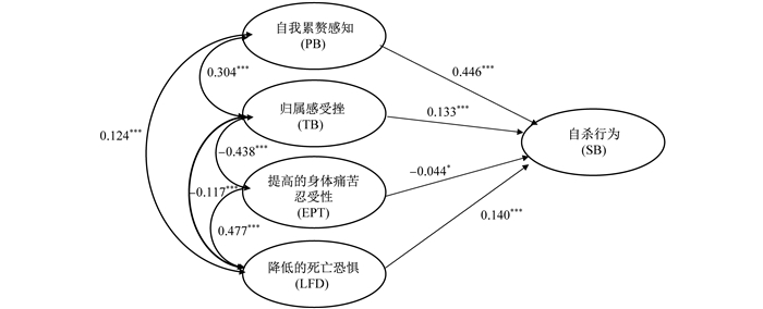 (二) IPTS的检验我们依据IPTS构建了两个模型(图 1和图 2),用以检验该理论在我国大学生自杀行为中的适用性。图 1给出了自杀的人际心理状态(包括自我累赘感知和归属感受挫)和习得的自杀能力(包括提高的身体痛苦忍受性和降低的死亡恐惧)对自杀行为的预测关系。模型拟合数据良好(RMSEA =0.033, SRMR=0.041, CFI =0.938, TLI =0.929)。如图 1所示,该理论的四个核心构成之间的相关程度从较小到中等,表明不同构成所指向的建构有所不同。其中两个人际心理状态——自我累赘感知和归属感受挫——之间存在中等程度的正相关(r=0.304, P < 0.001),习得的自杀能力的两个构成——即提高的身体痛苦忍受性和降低的死亡恐惧——之间存在中等程度的正相关(r=0.477, P < 0.001)。降低的死亡恐惧和自我累赘感知(r=0.124, P < 0.001)之间、和归属感受挫(r=-0.117, P < 0.001)之间均具有较低的相关关系。身体痛苦忍受性和自我累赘感之间的相关不显著,和归属感受挫则存在中等程度的负相关(r=-0.438, P < 0.001)。自我累赘感知(β=0.446, P < 0.001)和归属感受挫(β=0.133, P < 0.001)均显著影响大学生自杀行为。相比之下,自我累赘感知对大学生自杀行为的影响力度大于归属感受挫。在习得的自杀能力中,死亡恐惧感的降低显著影响大学生自杀行为的产生(β=0.140, P < 0.001)。身体痛苦忍受性的提高虽然也显著影响大学生自杀行为(β=- 0.044, P < 0.05),但在影响力度上相对较低,且与IPTS所预期的方向相反。