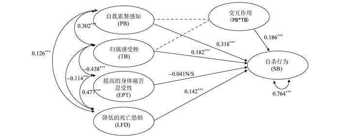 按照IPTS,自我累赘感知和归属感受挫不仅各自对个体的自杀意愿或行为产生影响,两者同时出现还会产生叠加效应(Van Orden et al., 2010; Orden et al., 2008)。图 2给出了添加了自我累赘感知和归属感受挫的交互作用的模型拟合结果,用以检验这一假设。如果出现叠加效应,两个变量的交互作用应该对自杀行为具有显著影响。如图 2所示,在自我累赘感知和归属感受挫具有显著影响作用的基础上,两者的交互作用也显著影响大学生的自杀行为(β=0.186, P < 0.001)。个体同时经历自我累赘感知和归属感受挫,会进一步强化自杀意愿,导致自杀行为的产生。除此之外,该模型中不同变量的关系在模式、力度和方向上和图 1总体一致。唯一不同的是加入交互作用后,身体痛苦忍受性的提高不再显著影响大学生自杀行为(β=- 0.041, P=0.07)。