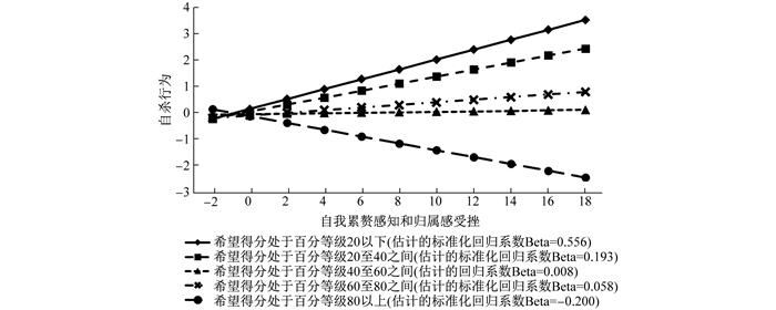 为了进一步明确希望在大学生自杀行为中的具体调节功能,本文将分析样本中的被试按照希望得分从低到高均分成5组,利用线性回归分析,分别估计在不同希望水平上人际心理状态对自杀行为的影响情况。图 4给出了具体的分组、各组内估计的标准化回归系数,以及不同希望水平上人际心理状态和自杀行为的关系。五个希望水平组从低到高,相应的标准化回归系数分别为0.556,0.193,0.008,0.058,-0.200。如图 4所示,随着希望水平的提高,人际心理状态对自杀行为的影响方向逐渐由正转负。随着自我累赘感知和归属感受挫水平由低到高,整个图形自左至右呈扇形分布。当自我累赘感知和归属感受挫水平较低,即人际心理状态相对良好时,希望水平的调节作用不明显。但是,当人际心理状态逐渐恶化时,希望的调节功能逐渐增强。具体来讲,当自我累赘感知和归属感受挫水平提高,人际心理状态恶化时,高希望水平会起到缓冲的作用,降低心理状态导致自杀意愿和行为产生的可能,表现为对应的回归系数是负值。然而,同样情况下,低希望水平会起到催化的作用。个体缺乏希望,或者处于绝望悲观的心态,会进一步放大自我累赘感知和归属感受挫对自杀行为的影响,表现为对应的回归系数是正值。