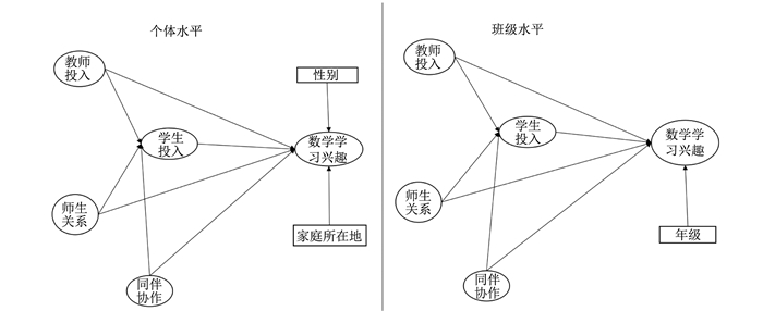 三、研究与发现:课堂人际知觉对学生学习兴趣影响的多水平实证 (一) 研究假设教师投入、学生投入、师生关系和同伴协作均能有效促进学生学习兴趣的发展。首先,教师作为课堂教学的组织者,对学生的影响是显而易见的。课堂上学生知觉到教师投入越多,就越有可能体验到积极情感(Skinner & Belmont, 1993),从而激发(或维持)学习兴趣。其次,学习兴趣产生于学生与所学内容的交互作用,个体投入的多寡与所学内容的交互范围、交互程度成正相关,学生投入越多则越容易产生或提高学习兴趣(何旭明, 陈向明, 2008)。再者,诸多研究表明,师生关系与学生的学习行为、学习投入和学习结果等密切相关(Roorda, Koomen, Spilt, & Oort, 2011;邹泓, 李彩娜, 2009)。和谐积极的师生关系会使学生舒适而轻松,更加愿意投入到学习活动中,学习兴趣更容易得到激发和维持。最后,课堂上生生之间的互动交流会增强学生课堂学习的积极体验,提高其学习主动性,激发或提高其学习兴趣(张萍, 沈雁华, 安婧,2018)。此外,也有研究提到,学生感知到的教师投入会间接带动学生投入(何旭明,2014)。同样,师生关系和同伴协作也会促进学生投入(Roorda, Koomen, Spilt, & Oort, 2011;赵贞卿, 2018)。综上,我们假设,教师投入、师生关系和同伴协作除了能直接影响学生的学习兴趣外,还能通过带动学生投入,二次激发其学习兴趣。
