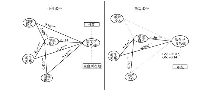 图 2 课堂人际知觉与学生学习兴趣关系的多水平结构模型路径图 注:* * * p < 0.001, * *p < 0.01, *p < 0.05。协变量均以虚拟变量的形式加入模型,其中女性为性别变量的参考组,农村组为家庭所在地变量的参考组,四年级是年级变量的参考组。图中虚线表示路径不显著。年级路径中,G5表示5年级,G6表示6年级。 |