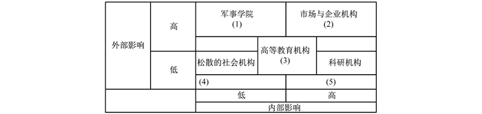 外部环境影响高和内部自由空间小的军事院校,会面临很高的组织压力和很少的个人表达机会。受市场影响大的企业机构面临外部竞争造成的强大的组织压力,同时企业的性质又给予了个人创造性和主动权的无限自由空间。松散的社会组织受内外部的影响都很小,既没有规律性的行为,也缺乏标准的操作程序,它们被无联系的个人影响所替代,其决策与运转并不被作为整体性的组织来看待。以基础研究为主的科研机构受到外部影响小,更多地是一个自主性组织,研究很少受到来自外部的限制,科学研究机构不是外部下达什么任务或者投入巨资就可以改变科研规律的,自主研发需要尊重科研规律。高等教育组织受到中等程度的外部环境和内部决策的影响,导致了目标的模糊性,增加了管理与治理的难度。