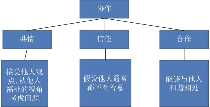 协作(collaboration)一直被认为是学生发展的关键指标和核心素养。善于协作的人能够成功地与他人合作,并通过保持积极的态度来减少人际冲突和达成最终目标。OECD社会与情感能力调查对协作下了一个十分简洁的定义,即“关心他人的福祉”(concern for the wellbeing of others)。乐于协作的人会表现出积极的情感态度,能够关怀、善待他人,对他人持有积极的普遍信念(Soto & Johns,2017)。从概念上来看,协作的内涵会显得十分宽泛,但总体上可以概括为3个子维度:共情/同情(empathy/compassion)、信任(trust)、合作/关系和谐(co-operation/relationship harmony)。对于上述几个概念之间的关系,OECD社会与情感调查用图1的方式进行了直接展示(Kankaraš & Suarez-Alvarez,2019)。