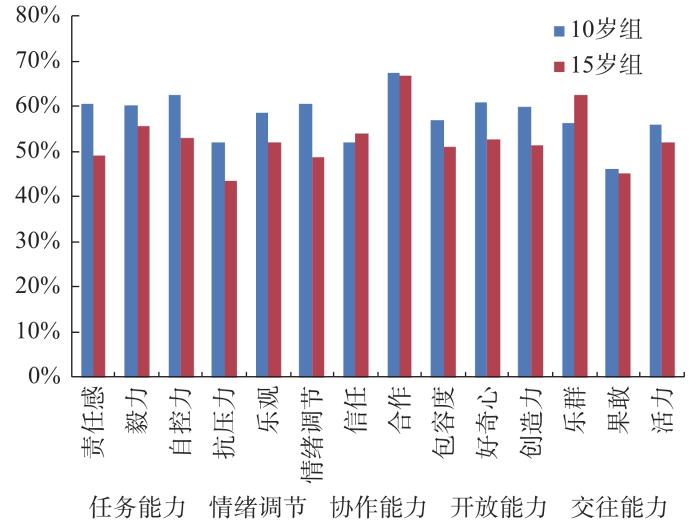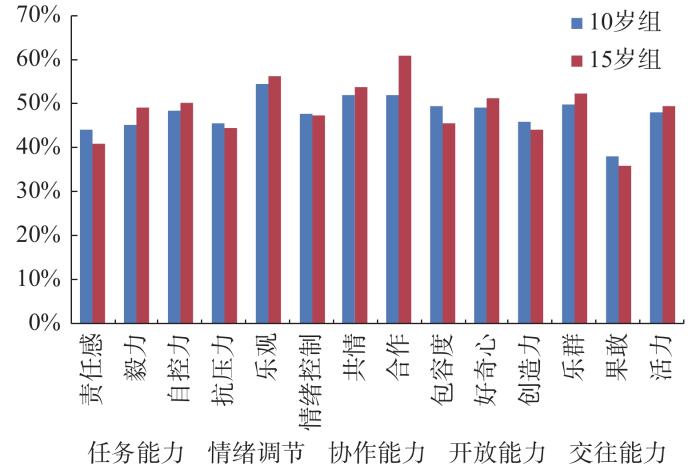 图4呈现了合作高水平的学生群体中,在其他14项能力上具备高水平的学生比例。从该图中可以看出,在合作能力上具备高水平的学生群体中,在其他14项能力上也具有高水平的学生比例也较高,大多超过50%。分年龄组来看,10岁组学生在大多数能力上的高水平比例要超过15岁组,而15岁组学生仅在信任和乐群两项能力上的高水平比例超过10岁组。