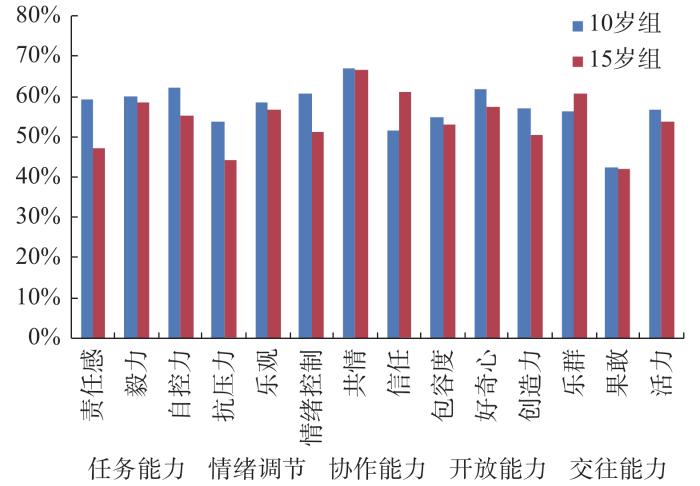 图3呈现了信任高水平的学生群体中,在其他14项能力上具备高水平的学生比例。从该图中可以看出,在信任能力上具备高水平的学生群体中,在其他14项能力上也具有高水平的学生比例一般超过40%(果敢除外)。不仅如此,10岁组学生在责任感、抗压力、情绪控制、包容度、创造力和果敢6项能力上的高水平比例要超过15岁组,但在毅力、自控力、乐观、共情、合作、好奇心、乐群和活力8项能力上的高水平比例要低于15岁组。