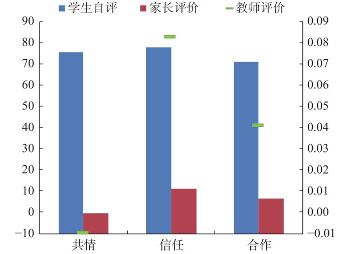 最后是生活质量的3个结果变量,包括主观幸福感、生活满意度和考试焦虑。对于10岁组学生而言,共情、信任和合作都对学生主观幸福感和生活满意度具有显著正向影响,都能够提升学生的幸福感和满意度。信任和合作都对考试焦虑具有负向影响,能够缓解考试带来的焦虑情绪。对于15岁组而言,共情对主观幸福感具有显著正向影响,对考试焦虑具有显著负向影响;信任对主观幸福感和生活满意度具有显著正向影响,对考试焦虑具有显著负向影响;合作对主观幸福感、生活满意度和考试焦虑都具有显著正向影响。