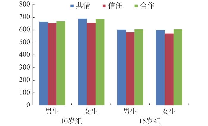 本文分别计算了苏州市10岁组和15岁组男女生在共情、信任、合作3项能力上的均值,并将结果绘制在图6中。从图中可以发现,在10岁组学生中,男生的3项能力均值都低于女生。其中,男生的共情能力均值为665分,比女生均值低22分;男生的信任能力均值为651分,比女生均值低4分;男生的合作能力均值为668分,比女生均值低17分。在15岁组中,情况刚好相反,男生在3项能力上的均值都高于女生。其中,男生的共情能力均值为601分,比女生均值高3分;男生的信任能力均值为579分,比女生均值高8分;男生的合作能力均值为605分,比女生均值高1分。上述数据表明,随着年龄的增长,男女生在协作能力上的差异会发生变化。在低年龄段,女生普遍优于男生,但到了高年龄段,男生却会全面反超。